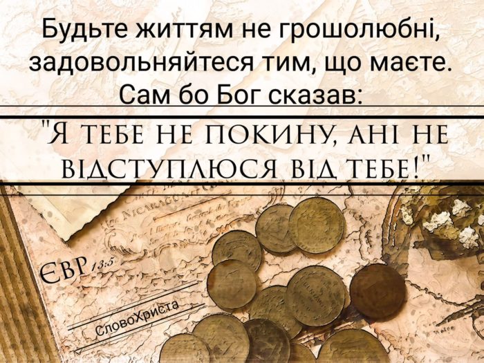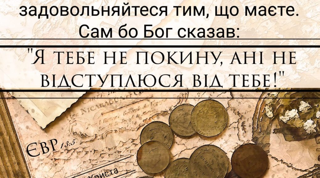 “Будьте життям не грошолюбні, задовольняйтеся тим, що маєте. Сам бо сказав: Я тебе не покину, ані не відступлюся від тебе!” (Євр 13:5)