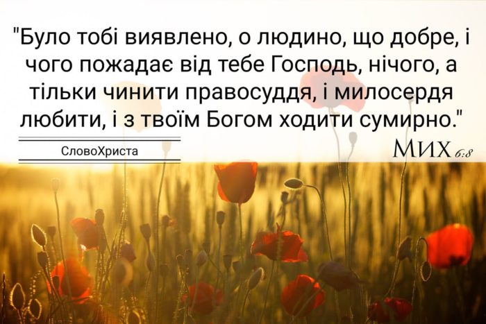 “Було тобі виявлено, о людино, що добре, і чого пожадає від тебе Господь, нічого, а тільки чинити правосуддя, і милосердя любити, і з твоїм Богом ходити сумирно.” (Мих 6:8)